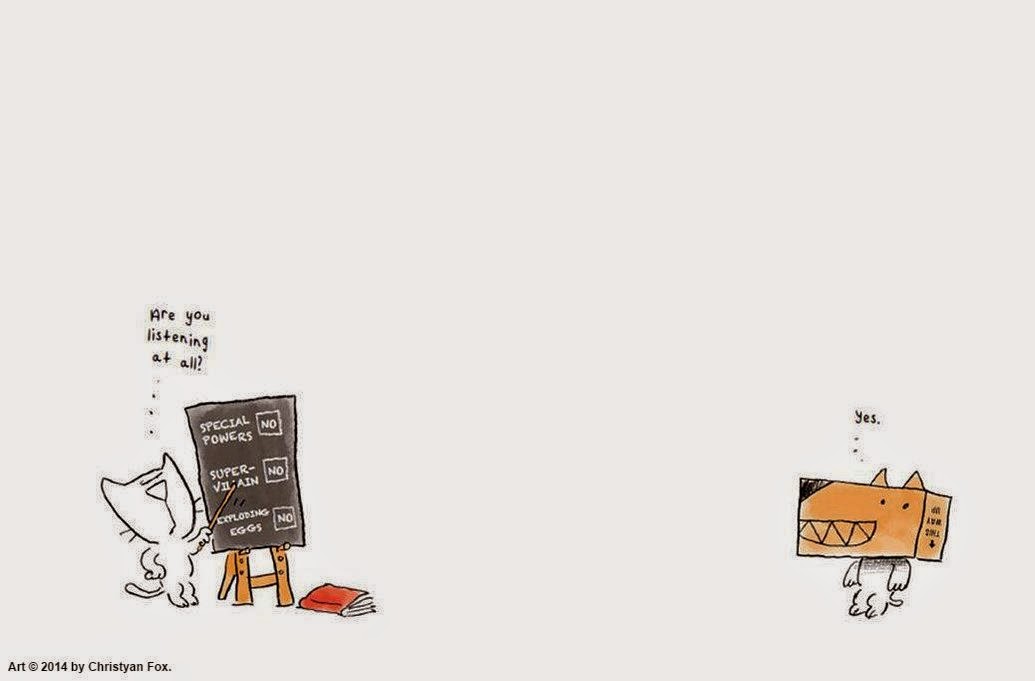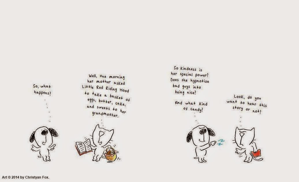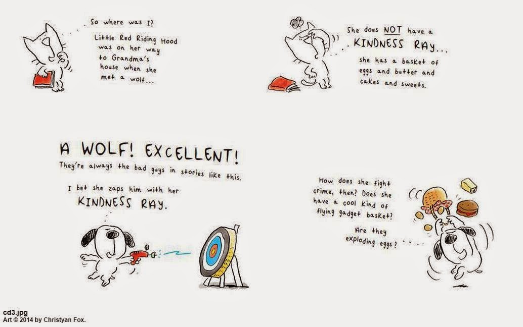 by Diane & Christyan Fox almost two years ago. This past weekend as my four-year-old nephew and six-year-old niece stayed over for a sleepover, I desperately combed my shelves for "new(ish) to them" books they would both enjoy. They are well and widely read so that is a challenge, especially if I am looking for books short enough to keep bedtime a reasonable hour. Even my hundreds of picture books were at a lower batting average for our immediate needs Friday night. Fortunately, Kensie doesn't think picture books are below her, but just loves words however they are presented. Yay her! Although she would prefer to have the long, long fairy tale picture books read to her, her brother isn't that interested or patient with those unless there are trucks involved.Well, this was one of the books that successfully came off the shelf--getting laughter and giggles from both of them--and was demanded as a reread, especially by Clark. He ran up to me the next morning with, "You said you would read this one again in the morning." So we did. He laughed some more and thought it was great fun that Dog thought of Little Red Riding Hood as a Superhero story. He understood all of the humor, laughing without prompting, so he is the perfect age for it now. Kensie had a few triumphs as she was able to read some of the lines herself, too.
