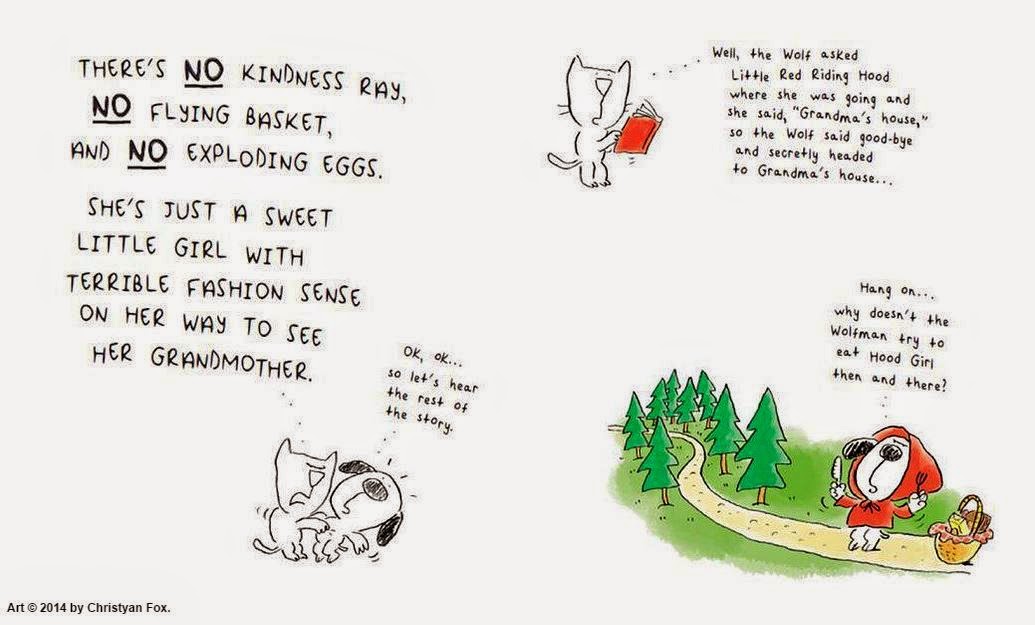 So most kids under four-years-old won't appreciate the humor. The text also works well as a read aloud, but the illustrations don't accommodate a story time setting either, say in a kindergarten or 1st grade classroom. But honestly, it will be best appreciated by literate kids who can get some of the jokes on the pages by themselves, such as the Cat's checklist. So it's a read aloud with one or a few children who are a little older and will get the humor. That said, the humor is fun and it's a good book. I'll share a video and illustrations below. A good buy for libraries and an amusing fractured fairy tale interpretation of Little Red Riding Hood for classrooms. Parents with kids who like to ask a lot of questions will also enjoy it out of sympathy for the cat.