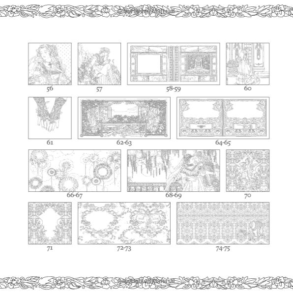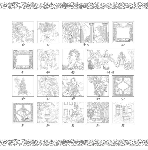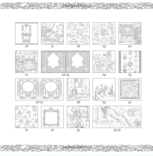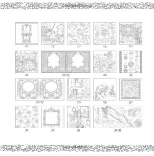 Anyway, here are some illustrations as well as pages showing the coloring pages index from the book. Awesome concept! Shows you that there are a lot of pages to illustrate. Click on images to see them larger.