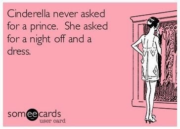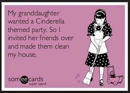 Time for a Cinderella themed Sunday Funny. This one is all over the web in several permutations (granddaughter, niece, daughter) and I don't know who first thought it up, but this was my favorite image found at SomeECards. That's my kind of Cinderella party! Don't think the Kensie niece would enjoy it though.