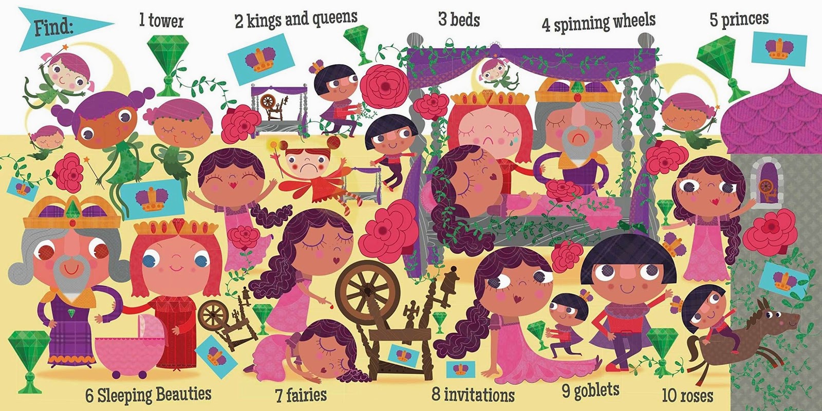 In FAIRY TALES SEARCH AND FIND, kids will have tons of items to discover and count! This engaging book will encourage children to learn their numbers from 1 through 10 while they search for over 500 objects (such as princesses, wands, flowers, witches, etc.) to spot, identify, sort, and count. This book is ideal for expanding vocabulary and progressing language skills as well as aiding storytelling skills.