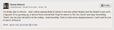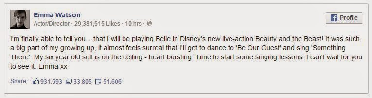 Slow news day, I think, since Emma Watson's announcement that she will be playing Belle in Disney's live action version of Beauty and the Beast has been a top news story all day. I think that is fine casting and all, but didn't expect to see it as a top headline on CNN. See Emma Watson to play Belle in new live-action 'Beauty'.