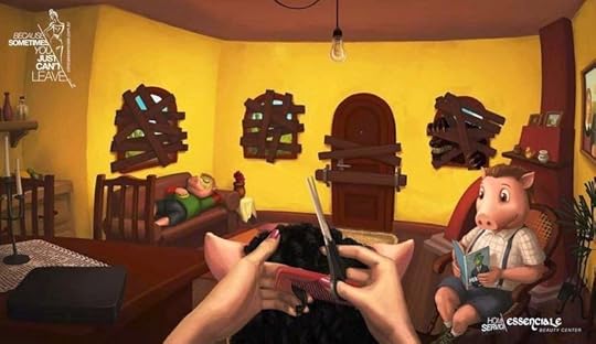 Again, fairy tales to advertise anything. Just anything. Clever concept and it also invokes the darker side of some tales that usually we don't consider. That Three Pigs image below isn't meant to be dark, but it has that overtone to me as I think about it. I had a visceral reaction to it for some reason. Homebound fairy tale characters, hmmm.... And my brain starts composing a story of an agoraphobic Rapunzel, too. Double hmmm....