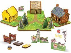 Bring the classic story of the Three Little Pigs to life with this darling play set. Start by reading the included storybook and then build the three little pigs' houses and furniture. Use the pig and wolf dolls to act out your own version of the fairytale. The Three Little Pigs houses come together to make a fun and exciting neighborhood to play in! The straw and stick houses are designed to "blow down" easily while the brick house stands strong. The wolf actually fits down the brick house chimney, only to land in a pot of boiling soup. The toy house and furniture assemble by pressing tabs into tab holes. No tools or screws required. And, all of the pieces store flat in a small carrying case. Made from EVA foam and cardstock. For ages 3 to 6.