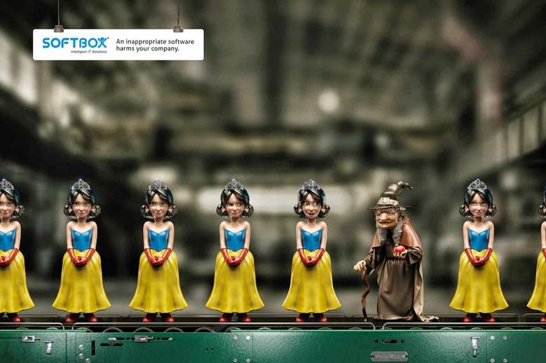 Here's a campaign that offers more than one fairy tale. And it's an unexpected advertiser, too. Didn't imagine software using fairy tales like this, did you? I really like the LRRH figurines. But wow, with that apple in the Snow White ad we could get a whole lot of software jokes courtesy of a certain company, yes?