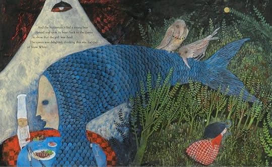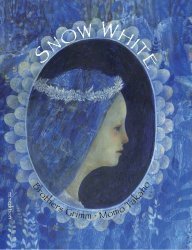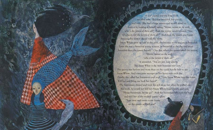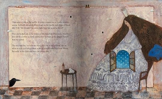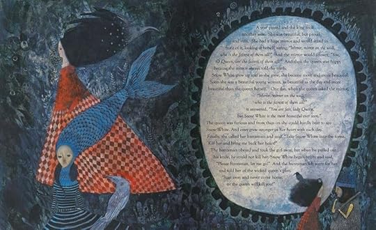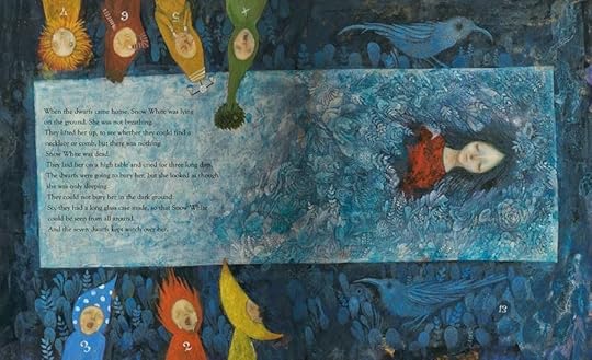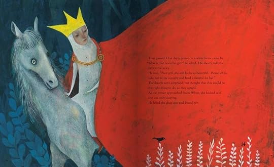 ) and in other languages in Europe. It still hasn't made it stateside, but that never stops me from sharing pictures, does it?The cool palette for this book is quite unusual for the reddish Snow White. The emphasis here is on the "snow" element of her beauty and world. She wears red through most of the book, but her world is blue and green tones overall.