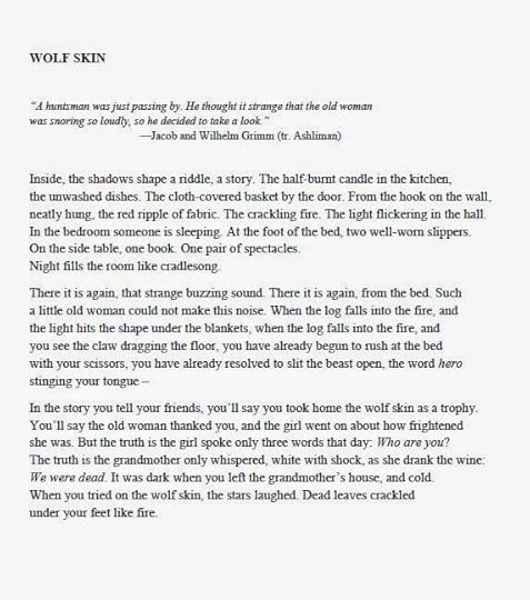 Most, but not all, of the 19 poems hidden within the pages are fairy tale related. An image of the title poem is below, courtesy of the publisher. Two additional poems can be read online: "Old Woman Gothel" at Pedestal Magazine and "Heyghoge" at Painted Bride Quarterly. Six of the 19 poems are a sequence devoted to Rapunzel. Other Grimms' tales are represented, too, such as Little Red Riding Hood, Hansel and Gretel, and The Seven Ravens.