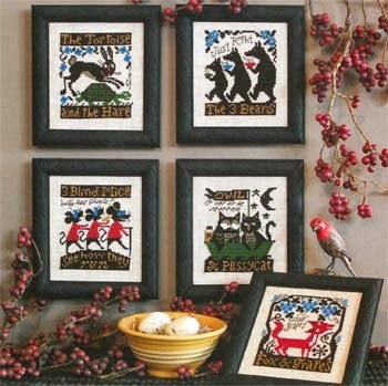 All of today's fairy tale cross stitch designs are by Prairie Schooler. I have shared the 3 Billy Goats Gruff previously, but the rest are all new to me. Hands down the Billy Goats are my favorite here. I just love that tale. The designs are slightly reminiscent of Arthur Rackham's silhouette illustration work, see here for example.