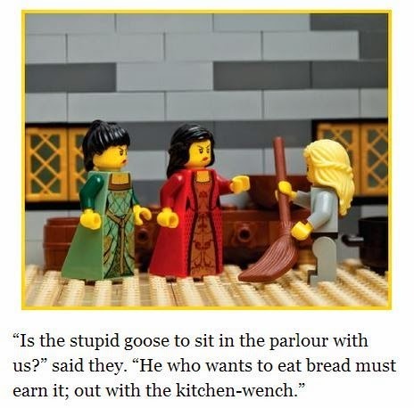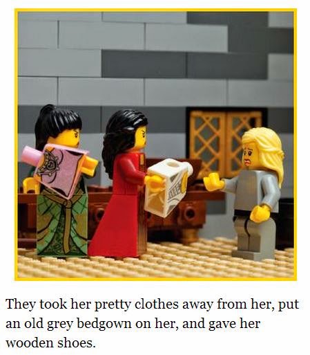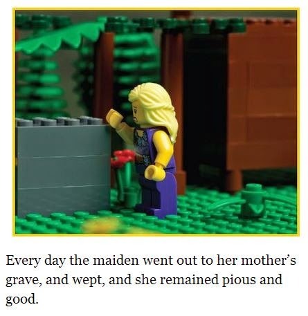 From previewing the book, this is one of the most thoroughly illustrated fairy tale collection outside of a graphic novel/comic book. Cinderella is broken down into many small scenes, such as picture below. I can see this being a hit with Lego fans, of which I have several in my family and circle of friends. I was also happy that the Cinderella they used is the German with our heroine visiting her mother's grave for consolation instead of awaiting a fairy godmother.