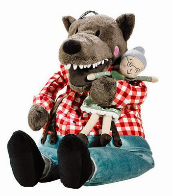 But the kicker--and my niece Leighton and I discovered this after a little play instead of reading labels--is that the WOLF CAN EAT GRANDMA. Yes, the toy is designed to stuff grandma down the wolf's gullet. But never fear, his shirt unbuttons and you can rescue grandma. So the child gets to be the huntsman or even Red Riding Hood in this scenario and rescue the granny from the wolf's belly.
