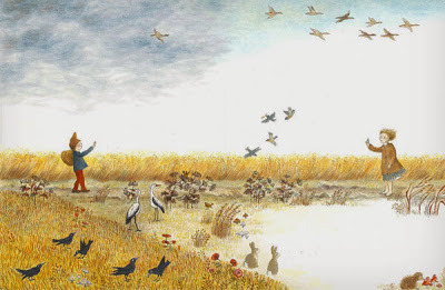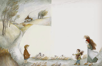 is a picture book of Die Sterntaler by the Grimms, usually known as The Star Money or The Star Talers (talers as in coins) in English. It's not as well known but it is beloved by many who do know it. The most famous image from the story is of the little heroine gathering falling stars into her dress. It appears regularly in fairy tale materials and many readers do not recognize the short tale. It is one I see the most questions about, so I thought I would highlight it here today.This book--the only English language picture book version I am aware of--is illustrated by Bernadette Watts who has illustrated many fairy tales, especially the Grimms for picture books. The cover image is sweet, here's a slightly larger version: