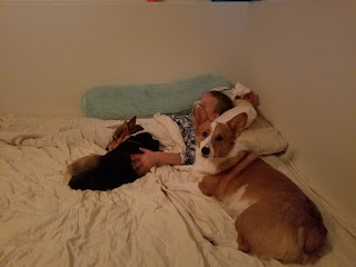 As soon as we got home, the dogs got to work making sure my youngest was comfortable and under constant surveillance.
