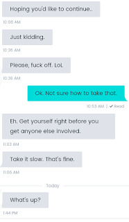 At one point, he mentioned that he was really enjoying talking to me and that he hoped it would continue. Within 30 minutes, that completely changed. Here’s the exchange (warning: bad language used! His message is gray, mine is the greenish):