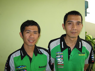 Ibnu (kanan) dan Hadi Wijaya, salah satu pembalap andalan Manual Tech. (foto: eko)Terlalu asyik dengan bengkelnya membuat kuliah Ibnu keteteran. Lelaki yang semasa SMP pernah menjadi pelajar terbaik se-Kabupaten Wonogiri ini akhirnya memilih keluar dari kampus.