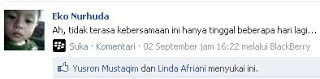 Mumpung ada Blackberry, update status dulu, ah...Jadilah saya excited betul adik perempuan saya menenteng Blackberry. Bisa jadi inilah Blackberry pertama di Desa Talang Datar, bahkan mungkin se-Kecamatan Bahar Utara, sebuah kecamatan yang berada di tengah-tengah kebun sawit dan jauh dari kota. Untungnya adik saya baik hati. Ia membiarkan saja saya menguasai BB-nya selama libur lebaran itu. Ah, mumpung ada BB, update status Facebook dululah biar keren. Hehehe...