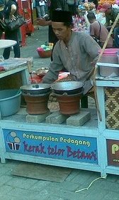 Pedagang kerak telor.Satu-satunya kelebihan Sekaten dari JakFair adalah harga tiket masuk. Pemkot Yogyakarta hanya mematok harga Rp7.000/tiket, sedangkan Jakarta lebih mahal sekitar tiga kali lipat lebih: Rp25.000.Sambil mendengar suara konser musik yang sayup-sayup sampai--menurut agenda yang tampil saat itu Glenn Fredly, Tompi, Andien, Citra dan Cassandra, saya dan adik berputar-putar memasuki setiap stand yang menarik hati. Sebagai "orang daerah", target utama saya adalah segala hal yang menjadi ciri khas Jakarta, terutama makanan. Satu makanan khas Jakarta yang langsung terbayang di kepala saya saat itu adalah kerak telor! Menurut cerita-cerita yang saya dengar, masakan (yang sengaja dibuat) agak gosong berbahan dasar telor ini nikmatnya luar biasa. Wajib cicip deh kalau ke Jakarta.