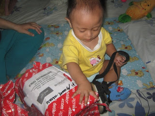 Begitu paketnya tiba, Damar anak saya (9,5 bulan) dan istri (cuma terlihat sebelah kaki dan tangannya) langsung merubungnya karena penasaran.Saya kira saya bukan pria romantis, jadi ikut Kuis Kejutan Cinta itu memang kegiatan iseng-iseng belaka. Melihat jawaban-jawaban dari peserta lain yang lebih muda, sebagian besar sepertinya masih anak-anak sekolah, terus terang saya pesimis. Eh, siapa sangka jika nama saya masuk daftar pemenang di kuis ke-2 yang dipublikasikan 16 Februari alias 2 hari setelah kuis digelar.