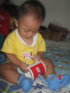 Si kecil Damar sedang asyik mainan mug Speedy.