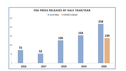 During the first half of the year, FDA issued a record number of press releases and nearly two-thirds (64 percent) were about COVID-19. The first release related to the pandemic appeared on February 24 to inform us about what steps the agency would be taking with respect to foreign inspections. FDA acted early and relatively often after that. The agency now issues daily updates on the topic.