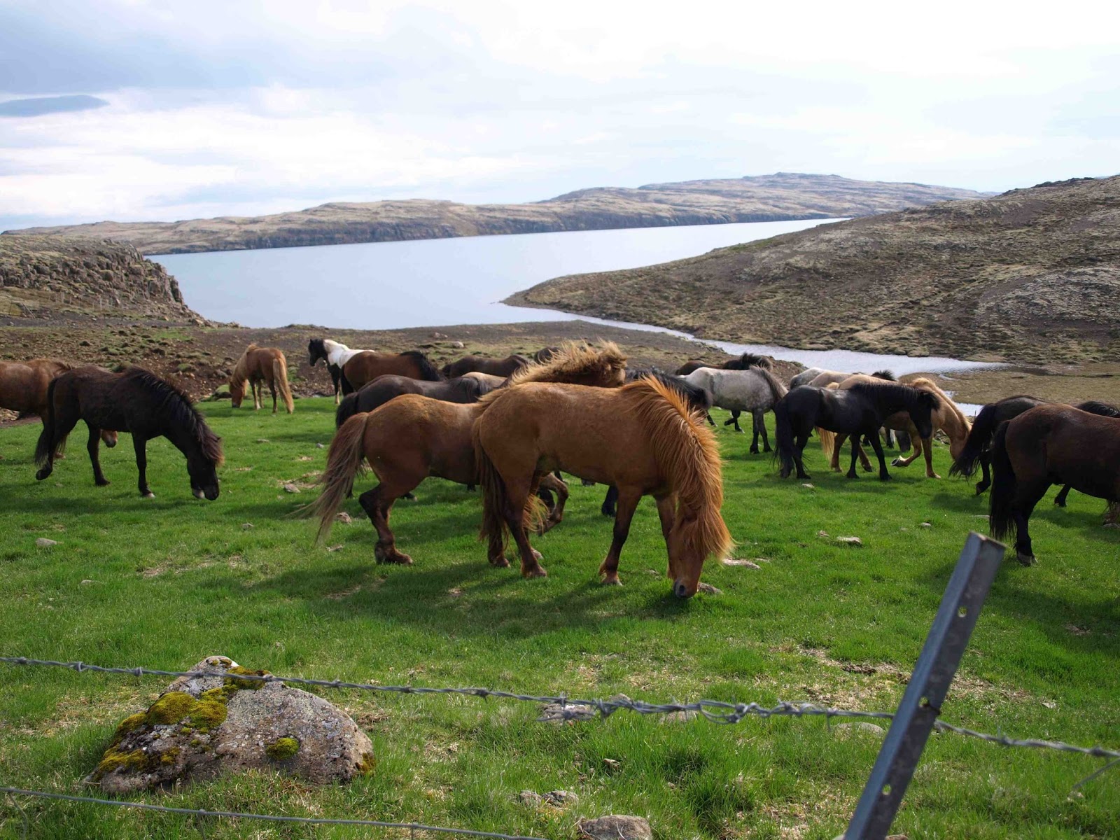 The farmer was at the gate to let us through. He and Halli exchanged a joke—maybe about the directions? He smiled and waved us onto a gravel road right alongside the Ring Road, separated from the rush of buses, trucks, and tourist traffic only by a strand of twine that the horses were convinced was electrified. It was not. We reached the tunnel: a metal culvert just high enough for riders and horses to safely negotiate. We tolted on through, our hoofsteps echoing. We had passed Bifrost, and no one took the Rainbow Bridge.