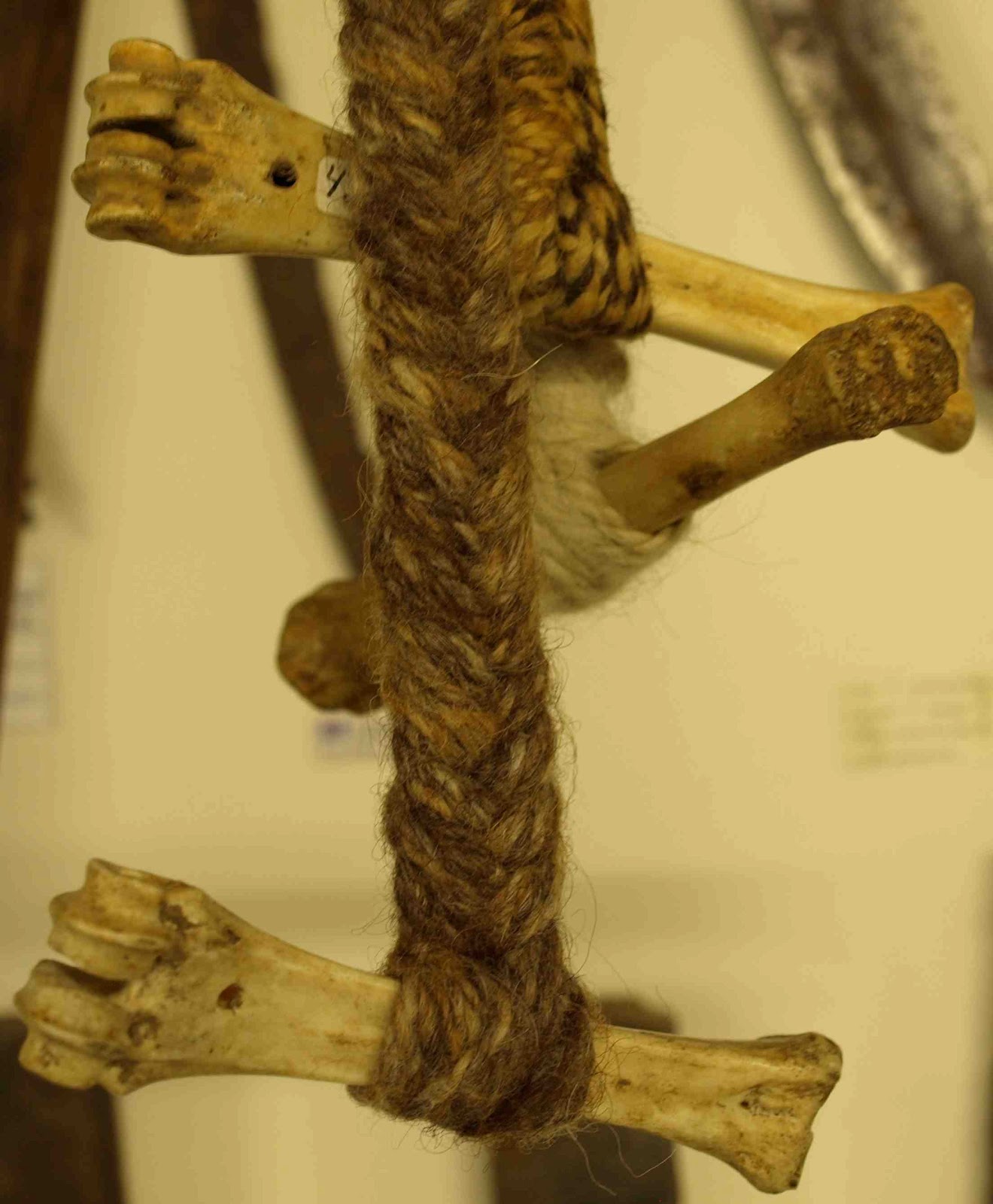 They are hobbles, Sirri explained. There's a loop at one end and a sheep bone at the other end of each rope. You twist the rope around your horse's feet and lock it with the bone so that your mount won't stray at night. At least, that's how these hobbles originally were used. Today the museum store at Glaumbaer sells them ... as wedding gifts. They're very popular, Sirri says.