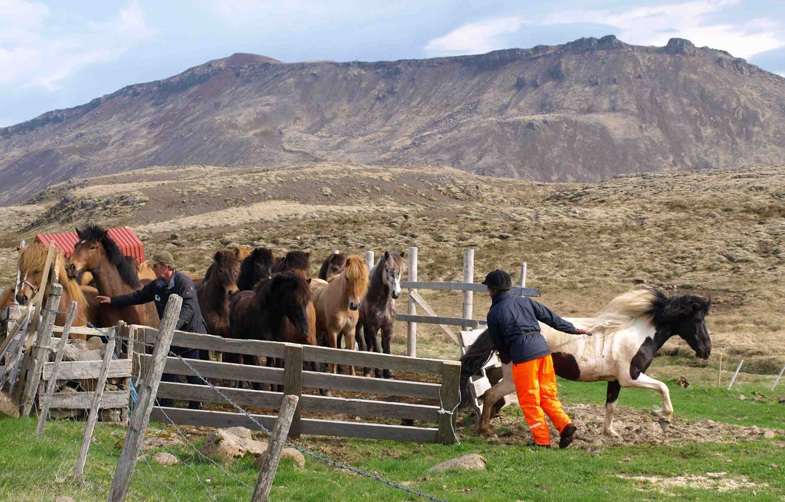We were six riders and 20-some horses. "Do you want to be in front or in back?" asked our riding instructor, Gudmar Petursson. The loose horses would be sandwiched between us for our day's ride of 30 kilometers, from Gudmar's farm, Stadarhus, up to Langavatn, the Long Lake, in the highlands of Iceland's Borgarfjord district. It was the first of four days of horse-trekking, in a tour the company America2Iceland designed around my book Song of the Vikings.I chose the back. I would see the herd running ahead of me--a splendid sight, a splash of color in the otherwise muted landscape of moss and lava rock, sand and just-greening grass. I could chum with Gudmar, who would be cowboying. And I would have more control over my horse's speed. Or so I thought.
