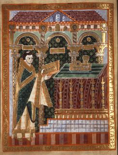 photo captions: A medieval astronomer. From a manuscript in Avranches, France. Bernward of Hildesheim presenting his book