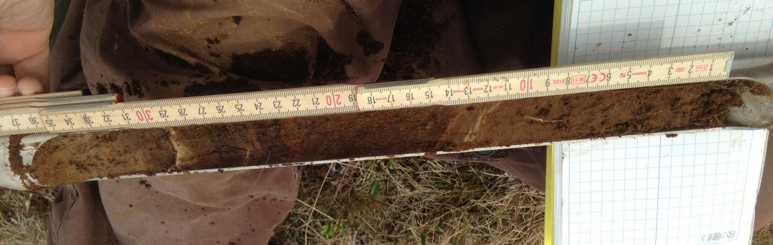 A sample soil core from the SCASS blog.I took up the clipboard to log in the color and depth of each soil layer and measure the location of the volcanic tephra lines. The honey-yellow line near the bottom of the core was tephra from an eruption of Mount Hekla nearly 3,000 years ago. It marked prehistoric soil, telling us we’d drilled deep enough. The shiny white tephra was more interesting: the distinctive marker left by Hekla’s eruption in 1104. In between there should have been—but I couldn’t see it—a thin dark gray layer. This tephra has been dated, by comparing its chemistry to dust found in the Greenland ice cores, to 871 (plus or minus two years). The date is remarkably close to when Iceland’s first historian, Ari the Learned, says Iceland was settled: 874. Archaeologists call this tephra the Landnám or Settlement Layer. Another, lighter greenish-gray tephra—also, unfortunately, not visible in this core—dates to the year 1000. Layers from 1300 and 1766, likewise conveniently color-coded, can also be found in Skagafjord cores.
