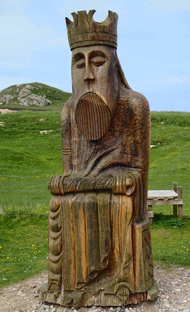 These iconic pieces also feature prominently in a 2013 mystery, The Chessmen, third in a series set on Lewis by the British author and television producer Peter May. While filming a Gaelic-language television series, Machair, on the shores of Uig Bay, May grew to know and love the area. A main character in The Chessmen, Whistler Macaskill, was inspired by those huge wooden effigies now posted at the airport, the distillery, the historical society, and the findspot at Ardroil. Whistler carves similar statues out of driftwood to sell to tourists. He's on the side of the Scottish Democratic Alliance (more or less), remarking to his friend, the policeman Fin Macleod, "They should be in Uig year round. A special exhibition. Not stuck in museums in Edinburgh and London. Then maybe folk would come to see them and we could generate some income here."