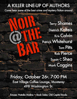 It’s going to get mysterious and maybe even a tad illegal down in Monterey on Friday, October 26, at the East Village Coffee Lounge. Look for trench coats, a suspicious marine layer rolling in like spilled pea soup, shady-looking folks in sunglasses, or just a gaggle of writerly types skipping along in the fog. When you see it, you’ll know you’ve arrived.Noir at the Bar is back in town.Thanks to crime fiction author Dietrich Kalteis, this year’s Noir is shaping up to be a killer one. He’s organized a sweet lineup for this year’s event, including authors Terry Shames, Kris Calvin, Tom Pitts, Rob Pierce, Susan C Shea, Mark Coggins, Kalteis himself, and me! The lovely Natalia Molina will emcee the event!Is it too cheesy to say it would be a crime to miss this night of literary mischief? God, that would be cheesy to say.This year’s Noir will be held at the East Village Coffee Lounge, at 498 Washington Street in downtown Monterey, beginning at 7 p.m. Books will be available for purchase thanks to the awesome folks at Old Capitol Books. Donations will be accepted at the door, benefitting a local charity!