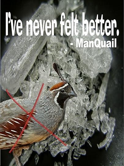 The death of ManQuail part one.Without a moment's hesitation, I charged into the road and dove right into traffic. This time I found myself dodging the giant behemoths. A cattle truck roared right over my back, shaking my ugly little body like an earthquake, and barely avoided getting squished by a the front tires of a Prius right after. Weaving and dodging kept me from being a pancake, but it took more time to cross this time. I'd already wasted so much of it looking in the wrong place that I began to worry. After making it across the street, I found a clump of old newspaper in the gutter, stuck in a storm drain by the curb, and hid there for a moment to get my bearings. This side of 89A offered very little when it came to hiding spots. When I figured the coast was clear, I crawled up and over, then made my way to the parking area on the side of the fifties style ice cream chain. That's when I heard a giggle in my head. It sounded far away at first, but I was able to hone in on it pretty quick. I could tell I was too late.A half block up the road, a black shape stumbled and fell into an old metal trash can. The shape was small, just the size of a small bird that rarely flew. It's stumbling gait indicated a stoned bird that rarely flew. I ran toward him and could hear the giggling turn to rambling sentences. I passed a baggy of white crystalline powder nearby, what remained of his meth, and kept going. When I got there, Glenn lay on his side against the trash. His feathered breast rose up and down feverishly. His eyes were wide open, nearly bugging out of his skull.