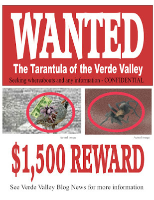 This story first began at the beginning of monsoon season earlier this summer. The tarantula was spotted falling from the sky by a drone performing operations over Sedona. Later, a tarantula was spotted with a quail near the site of a car wreck on State Route 89A in the red rock community. A tarantula was also spotted near the site of a crash on 89A in Cottonwood, and is believed to have caused the crash, but this time the tarantula was riding atop the quail holding a one hundred dollar bill. At the time the two weren't thought to be connected, until I spoke with Flight Services, LLC, owner Diana Sturgis, who owns the drone that originally caught the tarantula on video. She claims the tarantula that fell from the skies near Coffee Pot Rock was later recorded holding a one-hundred dollar bill as well. Coincidence? Not damn likely.