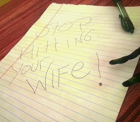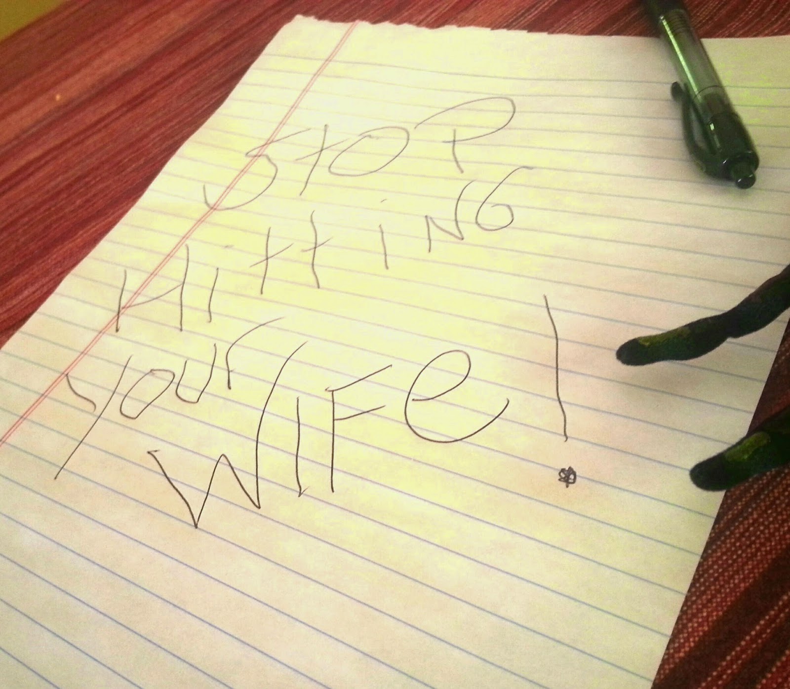 “Write ‘Stop hitting your wife’ and don’t worry about spelling or anything. That’s not important,” I said.