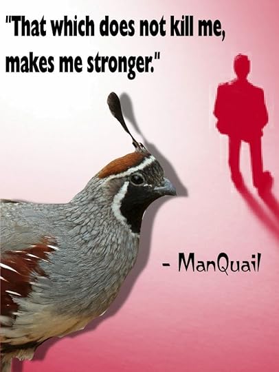 ManQuail Meme!ManQuail turned his head to the side, flinching, and stared toward the ceiling of our crappy little apartment as if expecting a bolt of lighting to flash off the ceiling fan and turn us both into fried chicken. When none came, he started for the bedroom, mumbling as he went. “Maybe you should sleep on it, Doug. You might feel different about things in the morning. And maybe, since the guy is a saint and all, he'll forgive you for being a dick to him. It's like I always say; if you can't handle me at my worst, you don't deserve me at my best. Maybe Kolbe knows you're stressed out beyond belief. He should. He isa saint.”