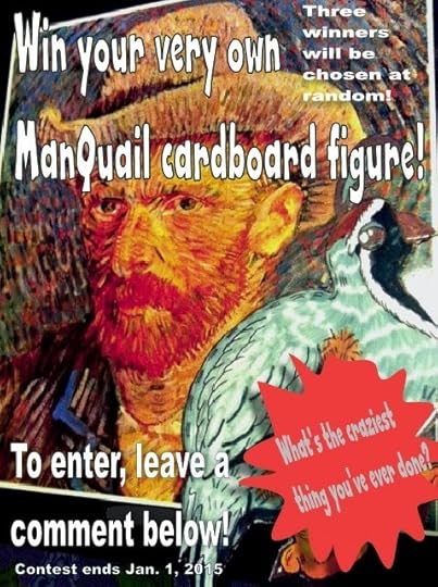 Win your very own handmade ManQuail cardboard figure. You could be one of three to get a Glenn of your own by commenting below on the craziest thing you have ever done! Each cardboard ManQuail comes with a letter from the man himself! Four winners will be drawn at random. Contest ends Jan. 1!
