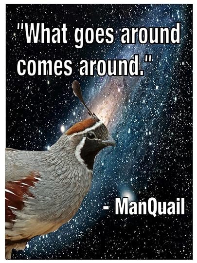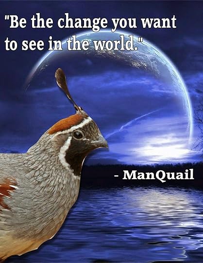 Not only that, I thought, but also predators are all over the place in Arizona, especially in the Verde Valley. I’ve seen javelina, coyotes, snakes of every length and design, and birds bigger than a microwave oven. It was only a matter of time before one of them made a lunch out of me. And maybe that wouldn’t be a bad thing either. But I also wasn’t thrilled with the idea of being eaten alive. Animals, however, cared less for the price of life than people did. Not when it wasn’t their life at any rate. They didn’t mind eating another animal while it was still alive so long as it didn’t fight back. Eventually it would die and that was good enough. “Not sure how we would get there,” ManQuail said. “You’re right about animals too. Lots of big cats out there hankering for a bit of quail meat. But we can always find a way. It’s like I always say: be the change you want to see in the world.”