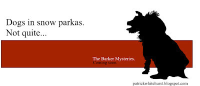 New promotional drawing for 'Monterey Noir: The Barker Mysteries,' coming soon from PageTurner Editions. Drawn with pen and colored pencils, sketch features Barker and two of his dogs.