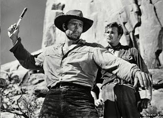 In the end, through diversion, McCracken kidnaps the wounded Garrett and uses him to force Rainbolt to tell where the gold is hidden. Rainbolt tricks the gang leader at the last minute, and pins him under a boulder which had previously been covering the gold. There is a powerful scene here where Rainbolt shows every intent of leaving the injured, pinned McCracken to die in spite of his pleas for mercy. He flings a handful of gold dust at him and snarls, “Here—die rich!” A few more gritty scenes like this could have lifted this movie a lot.Gondora and his riders show up at the last minute to kill McCracken and, not surprisingly, demand allof the gold for their trouble. Another chase ensues, this time with Rainbolt and Garrett fleeing a new bunch of bad guys. Spoiler Alert:The big climax involves our boys trying to escape by crossing a swollen, rushing river. They make good their escape but, in the process, the gold dust is washed away—back into the river where it came from—and nobody gets rich off it. From opposite sides of the river, Rainbolt and Gondora declare they will be friends once more should they ever meet again in the future. Then, left on their own, Rainbolt and Garrett decide they will go back to trapping ... it's a lot less dangerous and troublesome than gold.This movie is based on DESERT GUNS, a novel by Steve Frazee that I never read so I don't know how it compares. Leigh Brackett, notable for much stronger stuff, co-wrote the screenplay. Direction was by veteran Gordon Douglas who did everything from Little Rascal comedies to a blaxploitationmovie near the end of his career, with outings featuring the likes of Jimmy Cagney, Sinatra, and Elvis in between. He also prviously helmed FORT DOBBS and YELLOWSTONE KELLY (a far superior Western) with Walker.In the final analysis, I found this a watchable, mildly entertaining movie. Largely because I like Clint Walker a lot and, as noted before, the banter between him and Moore is enjloyable. But, somehow, I found myself thinking throughout that it just could have been a lot better.