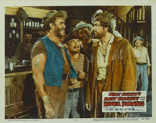 Hence, Davy Crockett and the River Pirates.It first aired in 1956, as a two-parter, once again on Disney’s popular TV show. DavyCrockett’s Keelboat Race was shown in November, Davy Crockett and the River Pirates came in December. The following year, the two segments were spliced/edited together for another full-length color feature that played in theaters. I had the pleasure of watching this version again (probably for the third or fourth time – though not for many, many years) when it played the other night on TCM. Both the little kid in me and what pretends to be an adult found it to hold up very well. The tale stems from a meeting between Crockett and the legendary/quasi-mythical river man Mike Fink. As the segment titles pretty clearly indicate, at first the two are pitted against one another in a rough and tumble keelboat race; then they join forces to battle a pack of marauders pretending to be Indians who are attacking/sacking boats that pass by their hideout at Cave-Inn Rock on the Ohio River.The leaders of the gang are the notorious Harpe brothers --- vicious, real-life characters, who truly committed river piracy, among other crimes, and were serial killers responsible for as many as 50 victims. As you might imagine for a Disney feature, this aspect of their villainy is not presented as part of the story here. As a matter of fact, the whole treatment of this adventure is done mostly as broad, semi-slapstick comedy. Jeff York, in the role of loud, boisterous Mike Fink (“I’m half wild horse, half cockeyed-alligator, and the rest o’ me is crooked snags and red-hot snappin’ turtle; I can out-run, out-jump, out-drink, out-cuss, and out-fight any man on both sides of the river!”), pretty much steals the show. And Buddy Ebsen, in the role of Davy’s pal Georgie Russell, displays masterful comic timing honed from years of vaudeville and earlier supporting roles. Fess Parker, as Davy, is the stalwart. And, over-arcing all the fun, there is plenty of excitement and rough-and-tumble action. The production values --- color, music, period touches, supporting players --- are all top notch.