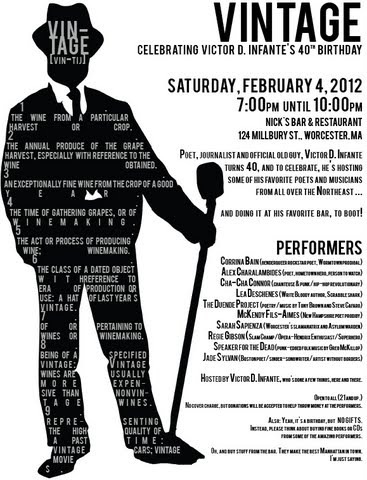 And the big news ... I'm turning 40 next month! To celebrate, I've leaned on a few of my favorite poets and musicians from across the Northeast to put together a blow-out show at Nick's Bar & Restaurant, called "Vintage," and everyone's invited!
