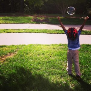 One of my favorite things to do on a sunny day is blow bubbles. My littlest son, Gus, and I like to find the sunniest part of our yard and take turns blowing bubbles through our many, many slippery bubble wands. Sometimes we chase them. He likes to catch as many as he can by smacking them loudly between his palms. Other times, we watch them as they drift and sail on the wind, winding higher and higher until we can’t see them anymore.