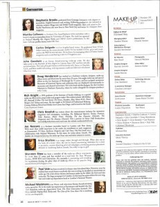 Well, one of our talented artists, who helped in so many creative areas of the Creation Museum and now with the Ark Encounter, is Doug Henderson. He joined us many years before the museum opened in 2007 to lend his talents. Doug is a well-known makeup artist, among his other abilities. For several years Doug taught at the well-known Art Institute of Pittsburgh in many areas related to moviemaking, from special effects to makeup. Well, Doug’s talents are acknowledged in the 100th issue of the magazine Make-Up Artist. A cover of the magazine is below: