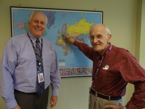 Here is a picture of Art with ministry CCO Mark Looy, an avid student of European history and who, in fact, flew over Belgium last Wednesday and—as he looked down below—thought of his friend Art and remembered Art’s service to his country. In the photo, Art points to Belgium on a world map where he played a role in rescuing Europe from Nazi tyranny. On this Veterans Day, our salute goes to you, Art. Thank you for your service—to America and also to AiG!