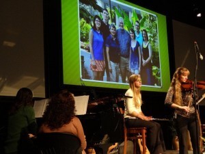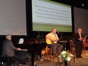 Tom Hill (far right) and Buddy Davis led in worship music, while I played the piano (Mally later joined us on the keyboard).