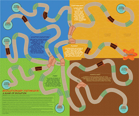 Students playing the game start at the spot marked “The Origin: Start Evolving Here.” Using “bricks” (e.g., Legos or some other available game markers) to represent a starting population, students progress through the game and try to survive catastrophes and “Extinction” squares. Students may draw “Chance” and “Advance” cards, which give various benefits and disadvantages to their populations. The game is over when a player’s population “Achieve[s] Adaptive Success.”