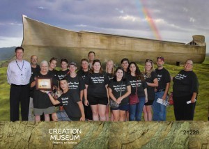 The church leaders have been using AiG resources to teach their youth over the years. They are a small church with only about 35 families, but they used our VBS curriculum The Egypt File recently with great responses from about 50 children. They also set a mission goal of raising $100 during the VBS for the Ark Encounter project (a full-size, evangelistic Noah’s Ark) and ended up raising $300, which they gave us last week! Attached is a photo of AiG’s Advancement Director, Joe Boone (far left), with their group after Joe presented them with an Ark Encounter sponsorship certificate.