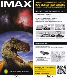 The hotel we were staying at had a display rack of cards and flyers advertising local attractions for tourists. As my 8-year-old daughter, Hannah, and I looked through the cards, my daughter pointed to one and says, “that’s the dinosaur at the Creation Museum.” As soon as I saw it, I recognized the dinosaur as well. Of course the Creation Museum isn’t a local attraction in Washington, DC. This bit of advertising was actually for the IMAX Smithsonian Theaters! The Smithsonian was using a Creation Museum dinosaur for their advertising purposes!