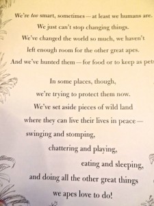 1. There are “lots and lots” of apes we call humans—I guess that’s why we can abort millions of babies—there are so many of us. But there aren’t that many of the other apes, so we need to look after them.