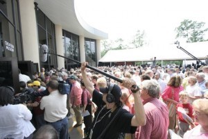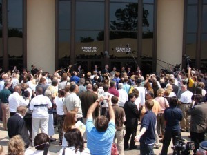Here is a photo taken on opening day at the Creation Museum almost five years ago—just as the ribbon was about to be cut and the doors to open. Notice the many boom mikes and cameras of some of the media present.