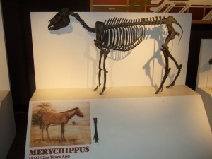 The display at the Kentucky Horse Park walks visitors through the evolution of the horse, stopping next at Mesohippus. One popular belief in regard to the horse evolution series is that as horses supposedly evolved, they got bigger. Eohippus is listed as 14 inches tall, while Mesohippus is listed as 24 inches tall. The next two horses in the display, Miohippus and Merychippus, grow steadily bigger. What’s the problem, though, with the belief that horses somehow evolved into larger and larger animals? If that were true, shouldn’t we see only very large horses today? But we don’t—horses vary in size from the Clydesdale to the much smaller Fallabella (just 17 inches tall).